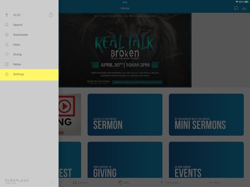 After downloading the Victorious Life Christian Center app, open up the settings within the app.